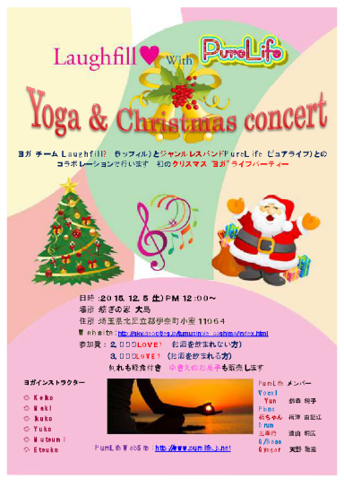 | ※2015の締めくくりライブは、なんと!ヨガとのコラボです。大勢の方のご参加お待ち申し上げます。 | |